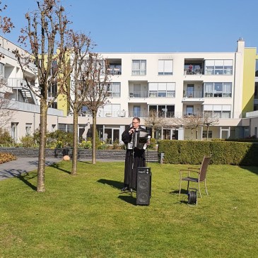 Bislang hat der Geistliche während der Coronakrise wöchentliche Kurzandachten per Mail an die Heime im Bereich der Evangelischen Kirchengemeinde Ahlen verschickt, die dann an die Bewohner weitergegeben werden können. Zusätzlich griff er kürzlich eine Anregung des Seniorenzentrums „Rosengarten“ auf, im Innenhof des Hauses einen Gottesdienst zu feiern. An den Fenstern saßen dazu zahlreiche Bewohner, die den Gottesdienst mitverfolgten, das Vaterunser mitbeten und auch „Großer Gott, wir loben dich“ mitgsingen konnten.