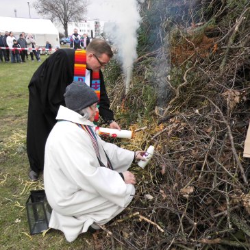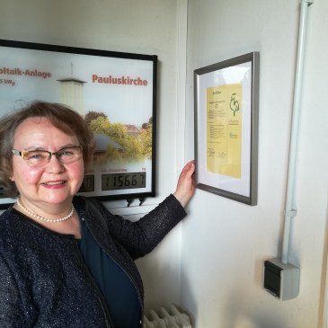 Dieses Zertifikat ist wirklich wegweisend: Die Evangelische Kirchengemeinde Ahlen ist als erste Gemeinde im Kirchenkreis Hamm mit dem Gütesiegel „Grüner Hahn” ausgezeichnet worden, das ihr ein professionelles und effektives Umweltmanagement bescheinigt. Dem ging eine gut zweijährige Bestandsaufnahme voraus, die ein Umweltteam unter der Leitung von Pfarrerin Martina Grebe in detailreicher Arbeit zusammenstellte. Die Ergebnisse und Informationen darüber, wie das künftige Umwelthandeln der Kirchengemeinde aussieht, sind in einem 50-seitigen Umweltbericht festgehalten worden (Download: www.evkircheahlen.de/ueber-uns/gruener-hahn/). Die Zertifikate wurden nach den Gottesdiensten am 22. April von Mitgliedern des Umweltteams (Foto: Marion Schröder in der Pauluskirche) in allen Kirchen angebracht.