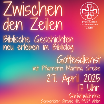 Ein neues Gottesdienstformat startet am 27. April um 17 Uhr in der Christuskirche (Gemmericher Straße 41a, 59229 Ahlen): Pfarrerin Martina Grebe wird dann unter dem Titel „Zwischen den Zeilen – Biblische Geschichten neu erleben“ einen so genannten „Bibliolog-Gottesdienst“ anbieten. Bibliolog ist eine Methode, mit der die Gemeinde einen biblischen Text gemeinsam von innen heraus erleben und auslegen kann. Er ermuntert zum Dialog zwischen biblischer Geschichte und Lebensgeschichte. Im Verlauf des Bibliologs werden die Gottesdienstbesucher eingeladen, sich in eine bestimmte Gestalt aus der Geschichte hinein zu versetzen. So können Aspekte entdeckt werden, die zwischen den Zeilen zu finden sind.